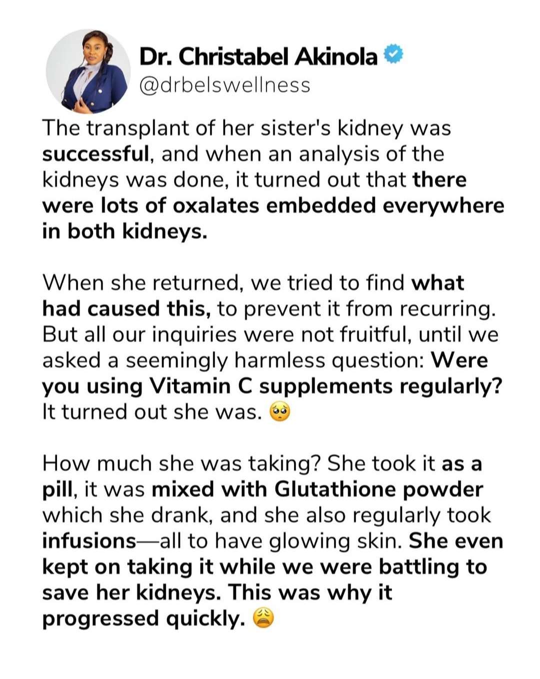 She said her case quickly resulted to a kidney transplant and after a successful transplant, she was asked a harmless question if she was taking Vitamin C supplements regularly and she said Yes, combined with some other supplements, which quickly knocked her kidneys.