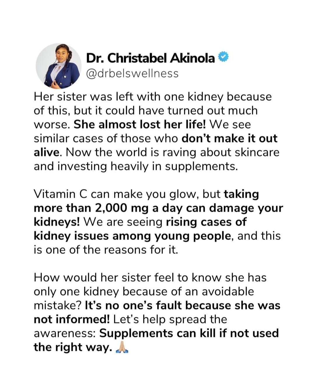 A Nigerian medical doctor, Christabel Akinola, is sounding a note of caution to women especially, who takes supplements to glow their skins.