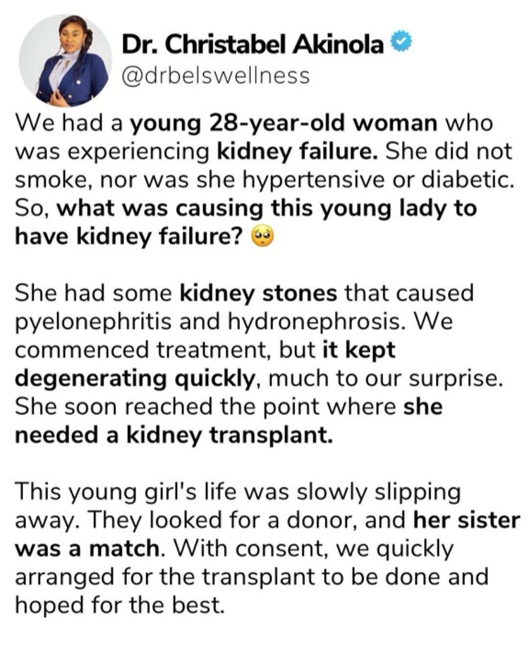 In a post shared online, Dr. Akinola revealed that the young woman was brought to their clinic after experiencing a kidney failure.